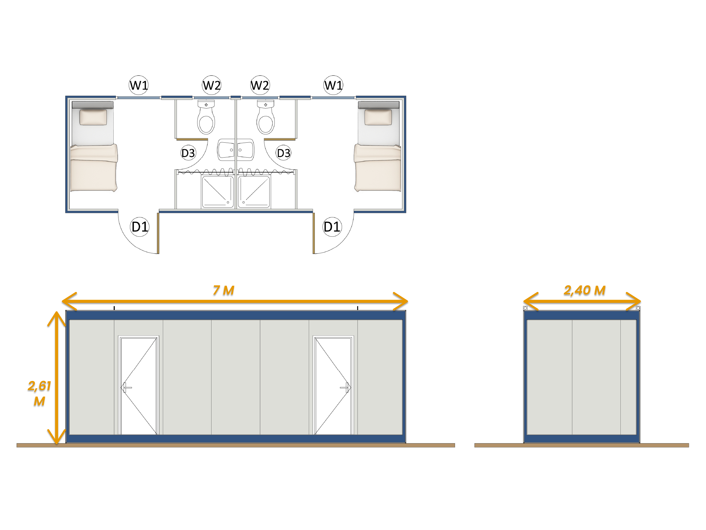 K-12 Çok Amaçlı Şantiye Konteyneri, şantiye sahalarında konaklama standartlarını zirveye taşıyan, mahremiyet ve konforun en üst düzeyde tutulduğu bir "Double Ensuite" (Çift Banyolu) yaşam ünitesidir. 7 metrelik geniş gövdesi içerisinde simetrik olarak yerleştirilmiş iki ayrı yaşam alanı sunan bu model, özellikle mühendisler, şantiye şefleri veya üst düzey yöneticiler için otel konforunda bir barınma çözümü arayan projeler için tasarlanmıştır.